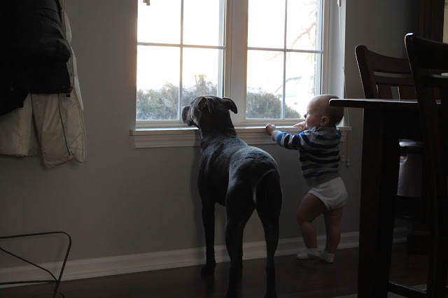 DEVELOPMENT/BEHAVIOR: Now for the fun stuff! These past few months Hank personality has really started to develop. He has started to like reading and will either sit and flip through books on his own or bring books over to me and plop down in my lap for me to read. He loves showing his excitement/curiousity by saying "woah" or "wow" or "woo" (it's probably my favorite word he is saying right now) - for example, I was blowing bubbles the other day and he was so impressed every time I would blow more and would yell out "ohhhhhh".... it was pretty darn cute. He isn't talking a ton (I'm pretty sure way less than Lucy was at this point, but I was told to expect that with my boy and with my second) but the main other words he says are momma, dada, ruff and this. He talks gibberish often, walking over to me, saying a sentence that seems to be as clear as day to him, but of course I have no idea what he's saying.